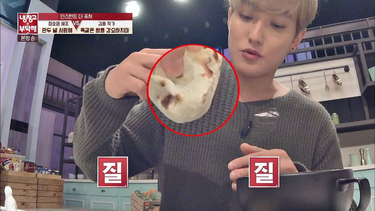 모두의 코를 찌르는 강렬한 김풍 요리의 향! 과연 그 맛은? 시식해 보는 강타, 춘빙에 '크림치즈 고등어 소스'를 싸서 먹으려는데 질질~ 먹기도 드럽게(?) 불편한 김풍 요리 막상 먹어보니 반전의 맛!! "안 비려요 맛있어요~" (풍씨 매직)